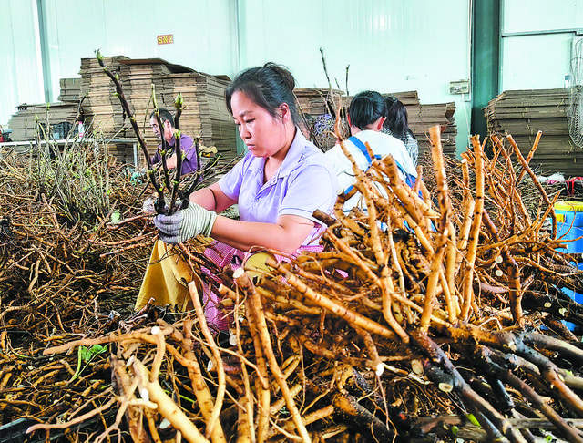 9月12日,在牡丹区黄堽镇的菏泽牡丹出口示范区,工作人员正忙着对即将“出海”的牡丹种苗进行加工作业。