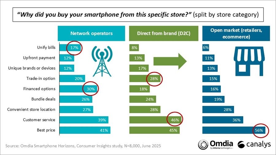 高级分析师Runar Bjørhovde表示:“市场影响力继续向最大的五家公司转移,这五家公司在2025年第二季度占创纪录的87%的市场份额。虽然这反映了差异化品牌和规模对于供应商盈利和可持续商业模式的重要性,但渠道内的竞争仍然残酷激烈。在这里,电信公司、零售商、电子商务专家和直接渠道(D2C)都在为获得和留住客户而激烈竞争。但对少数几家供应商日益增长的依赖使其难以脱颖而出。近年来,D2C和公开市场渠道都获得了一些份额,主要来自运营商。我们最近对8000名欧洲消费者的研究发现,直接购买的吸引力与和品牌互动的愿望以及感知到的客户服务有关,而开放市场渠道的吸引力主要与价格有关。运营商仍然是供应商进入市场的关键途径,也是推动5G和eSIM智能手机采用的关键催化剂。”