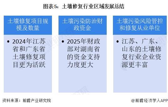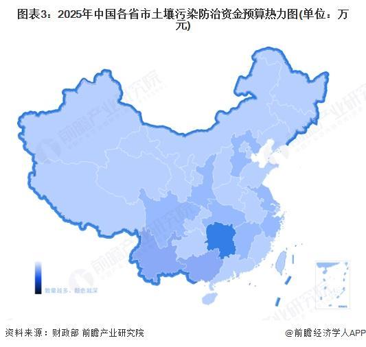 从国家土壤污染防治资金预算来看,《财政部关于提前下达2025年土壤污染防治资金预算的通知》中显示,2025年我国土壤污染防治重点区域在湖南、广西、云南等地,其中财政部对于湖南的土壤污染防治资金预算更是遥遥领先,共计5.87亿元,占总资金预算的比重达到19.0%。湖南省地貌类型多样,有色金属的品种和储量都非常可观,受历年来不完善的开采和管理技术的影响,导致土壤的重金属污染问题十分突出,因而财政部着重加大对湖南省土壤污染的防治。其次是广西和云南,土壤污染防治资金预算分别为2.7亿元、2.9亿元,占比为8.8%、7.4%。具备更高国家土壤污染防治资金预算的省市,一方面是面临更为严峻的土壤修复问题;另一方面国家对其在土壤污染防治上的资金资助有利于相关企业在该区域进行业务拓展。
