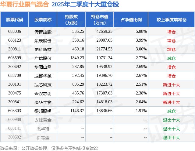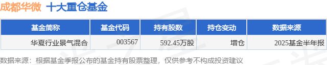 根据2025基金半年报公募基金重仓股数据,重仓该股的公募基金共1家,其中持有数量最多的公募基金为华夏基金的华夏行业景气混合。华夏行业景气混合目前规模为72.61亿元,最新净值4.4836(9月1日),较上一交易日上涨1.63%,近一年上涨88.88%。该公募基金现任基金经理为钟帅。钟帅在任的基金产品包括:华夏远见成长一年持有混合A,管理时间为2022年9月20日至今,期间收益率为29.17%;华夏招鑫鸿瑞混合A,管理时间为2024年1月16日至今,期间收益率为96.88%;华夏卓越成长混合A,管理时间为2025年8月12日至今,期间收益率为5.65%。